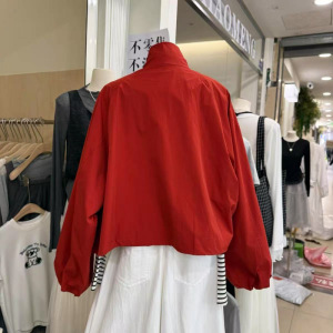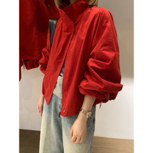 韩系红色立领廓形冲锋衣短外套女2025春季新款小个子休闲夹克上衣