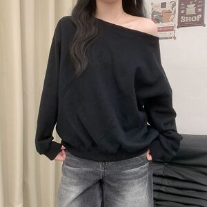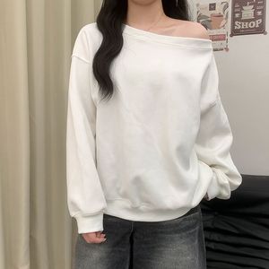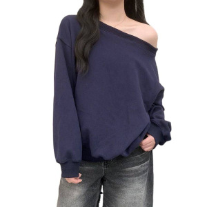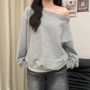 美式花灰色露肩斜肩卫衣女春秋季高级感宽松慵懒风斜角肩长袖上衣