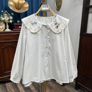 5 纯棉长袖秋装娃娃领花朵刺绣衬衫上衣女春秋新款减龄百搭宽松
