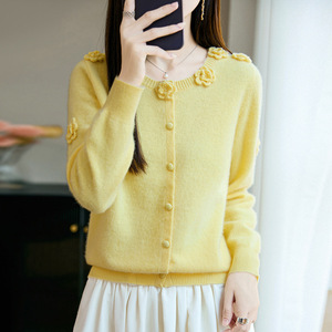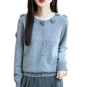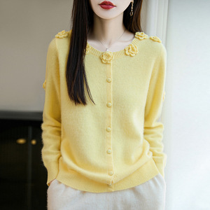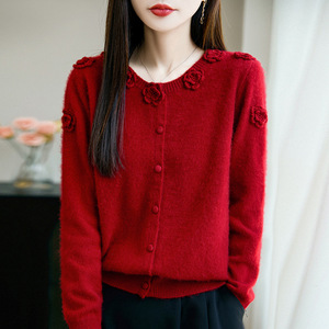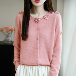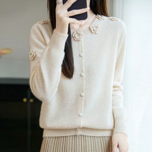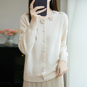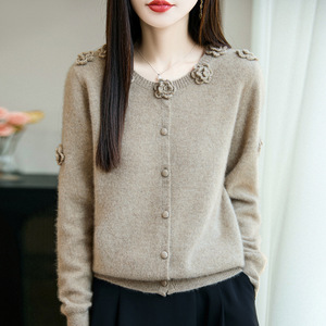 100纯羊毛衫圆领针织开衫女式九朵玫瑰手工钩花毛衣外套秋冬新款