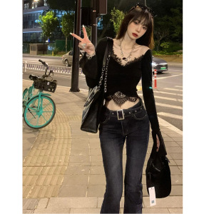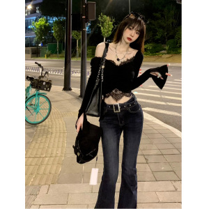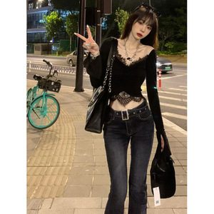 2025年款黑色V领蕾女秋冬辣妹纯欲修身短款打底衫上衣