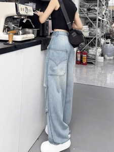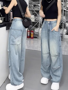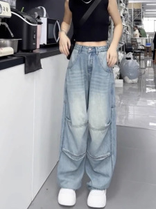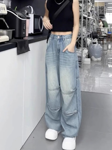 大码弯刀阔腿牛仔裤女2025新款秋季高腰胖mm显瘦宽松直筒拖地裤子