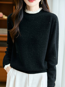 秋冬季新款纯色抽条欧根纱木耳领毛衣女内搭羊毛针织打底衫女