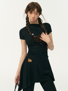 SOMESOWE 设计感短袖T恤套装女复古不规则斜肩上衣微喇裙裤两件套
