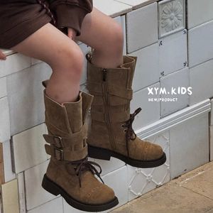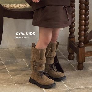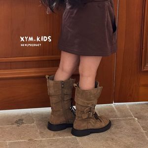 女童高靴2025年秋季新款儿童复古英伦风靴子双皮扣女孩真皮骑士靴