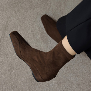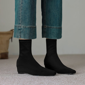 坡跟瘦瘦靴弹力靴秋季极简风小个子方头裸靴袜靴女靴短靴杏色绒面