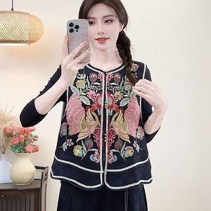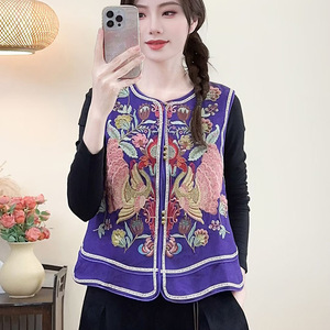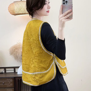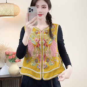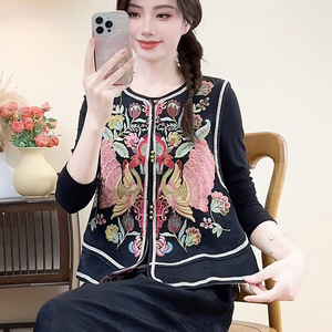 2025秋季新款圆领复古盘扣拼接无袖马甲纯色民族风刺绣宽松版马甲