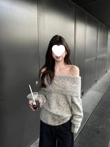 灰色露肩韩系套头毛衣女秋冬慵懒风宽松气质小个子长袖一字肩上衣
