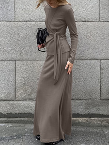 秋季小众设计感女装套装系带收腰圆领薄款针织长袖上衣长裙两件套