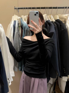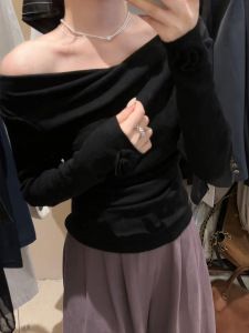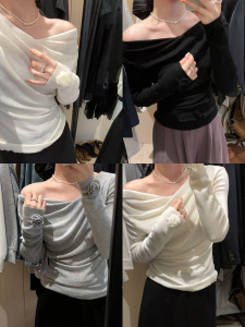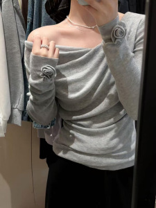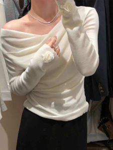 早秋白色立体花朵荡领露肩羊毛针织衫女春秋冬羊绒内搭打底衫上衣