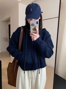 时尚慵懒风连帽针织开衫毛衣女秋冬季新款宽松短款休闲外套上衣