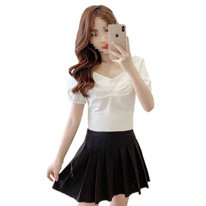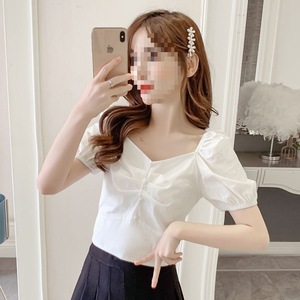 白色泡泡袖短袖衬衫女夏锁骨法式方领收腰短款复古设计感小众上衣