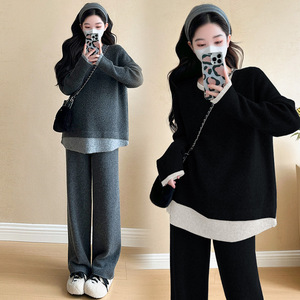 网红同款孕妇装2025秋冬新款简约高级感假两件针织上衣阔腿裤套装