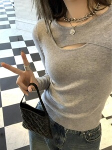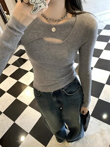 灰色镂空长袖正肩t恤女秋季新款修身显瘦法式别致内搭打底针织衫