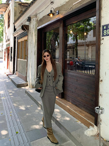 实拍~法式设计感毛呢西装外套+修身马甲+高腰A字半身裙时尚套装女