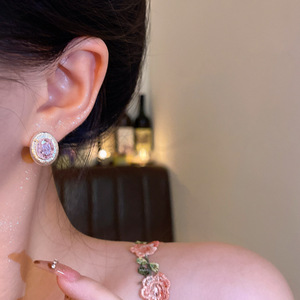S925银针鸽子蛋粉色锆石耳环女法式轻奢气质高级感耳钉复古耳饰品