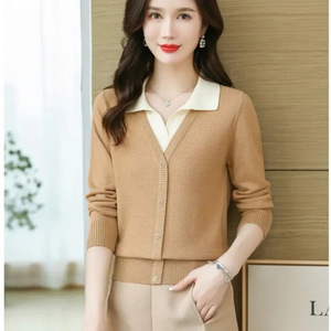 2025春秋新款宽松显瘦洋气时尚百搭翻领假两件女上衣针织衫打底衫