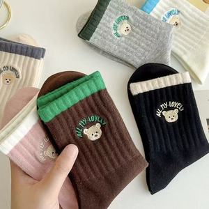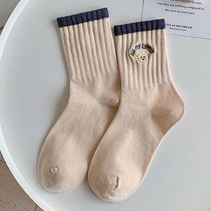 卡通可爱小熊袜子女中筒袜潮网红款秋冬纯色日系女生棉袜长筒长袜