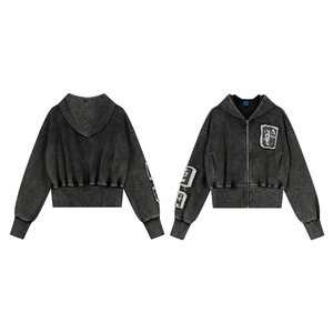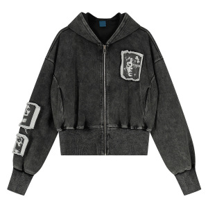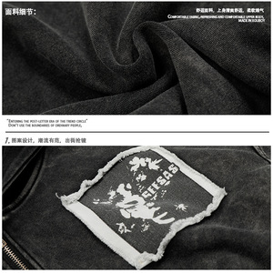 衣品男装原创美式做旧水洗黑贴布刺绣秋季拉链情侣中性外套夹克女