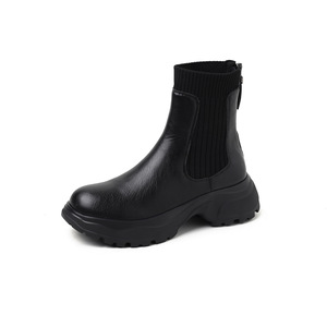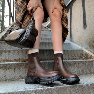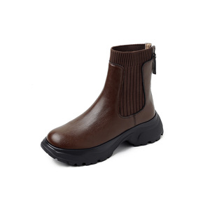 暴走舒适运动底牛皮针织拼接切尔西靴2025秋冬中跟厚底真皮短靴女
