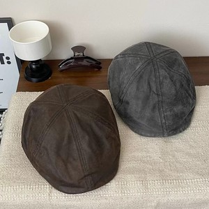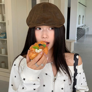老钱风韩系复古擦色做旧前进帽秋冬水洗皮质小众报童帽贝雷帽男女