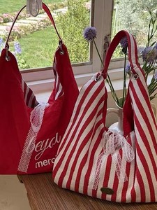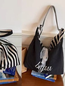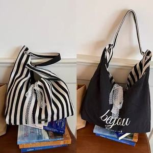 新款大容量简约慵懒托特条纹单肩时尚女包通勤百搭休闲帆布包双面