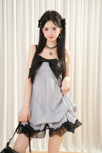古着vintsge黑白格连衣裙 日系蝴蝶结蕾丝花苞吊带裙2025夏小个子