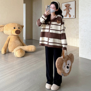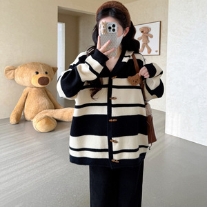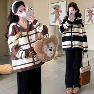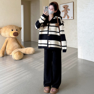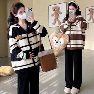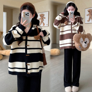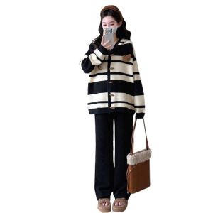 孕妇装秋冬季宽松休闲大码纹针织开衫外套连帽上衣孕妇直筒裤套装
