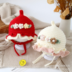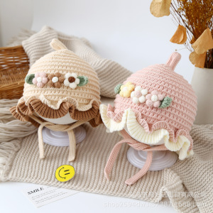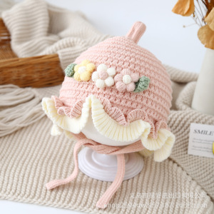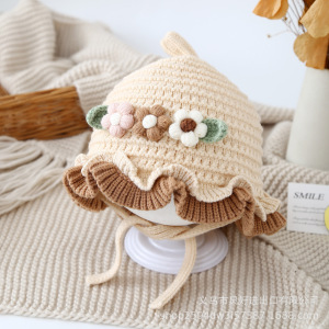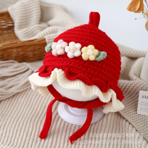 三朵花宝宝盆帽冬季公主洋气渔夫帽女童冬天保暖针织帽儿童毛线帽