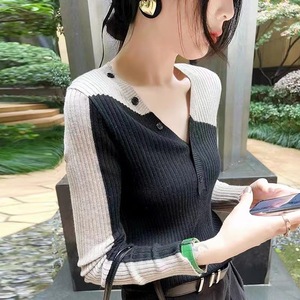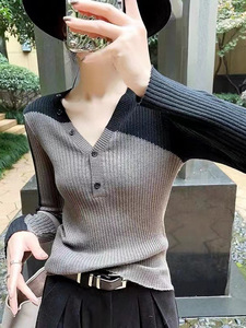 哥家商场同款女装2025秋季气质轻熟纽扣v领针织衫拼色坑条修身