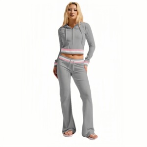 2025欧美女装 亚马逊新款时尚休闲螺纹撞色银狐绒开衫连帽两件套