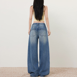 包邮 复古水洗深蓝低腰阔腿宽松牛仔裤直筒拖地裤长裤&加长