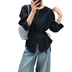 秋季法式气质设计绑带黑色圆领时尚休闲高级收腰显瘦长袖上衣女潮