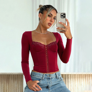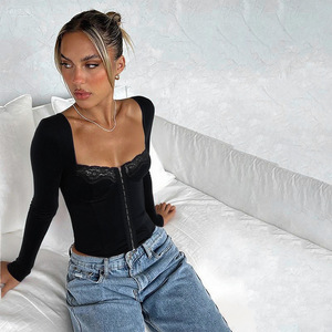 YL25270PFO跨境新款修身上衣女秋季蕾丝边收腰显瘦纯色长袖T恤女