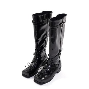 牛皮版芭蕾风厚底长筒靴女真皮蝴蝶结方头厚底粗跟高筒靴子骑士靴