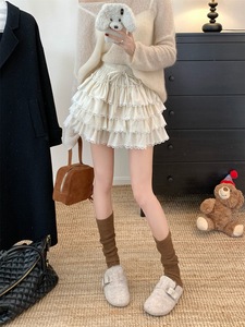 法式甜美蕾丝花边蛋糕裙女早秋高腰显瘦a字半身裙拼接木耳边短裙