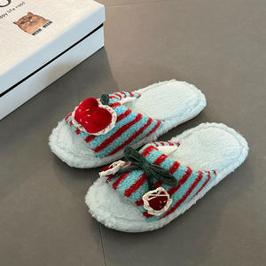 小众条纹殷桃配饰平底毛毛拖鞋秋冬季可爱卡通女生一字棉拖鞋潮鞋