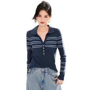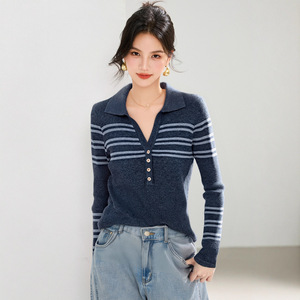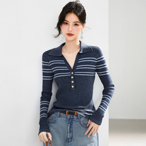 美式气质V领条纹针织打底衫内搭女2025秋装修身显瘦套头长袖毛衣