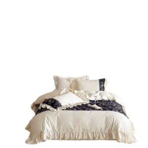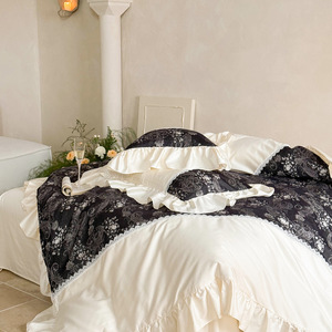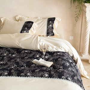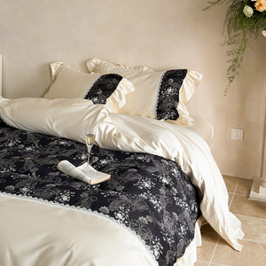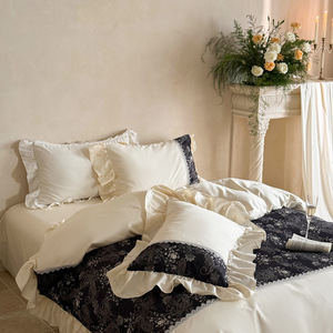 轻奢黑白拼接四季可用50支双股新疆长绒棉床品四件套蕾丝花边被套