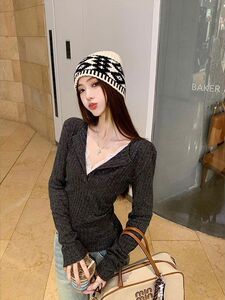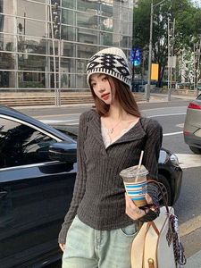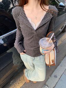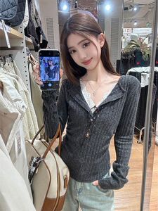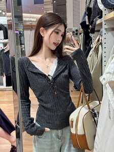 甜辣妹深灰色假两件蕾丝长袖T恤衫女早秋修身显瘦内搭打底衫上衣