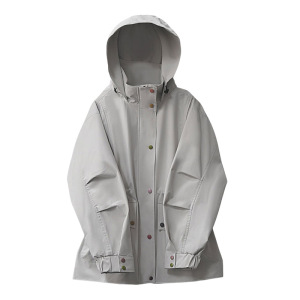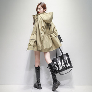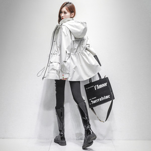 米白色风衣女中长款抽绳收腰显瘦春秋宽松连帽防水韩版工装正肩