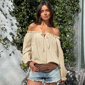2025秋季纯欲风欧美纯棉一字肩露背上衣女设计感提花镂空系带衬衫