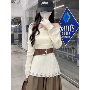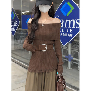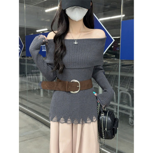 糖糖~秋季新款韩版时尚纯色一字肩长袖针织衫修身显瘦百搭上衣