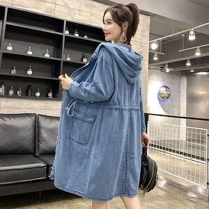 春秋大码女装200斤胖mm抽绳中长款连帽风衣女宽松洋气牛仔外套潮