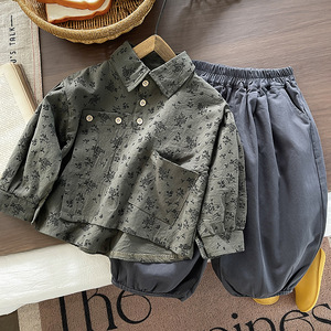 童装2025秋装新款森系儿童个性复古印花翻领衬衫男童女童长袖套装