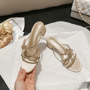 YX圆头蝴蝶仙女风凉鞋细高跟2025新款水钻凉拖鞋女粗跟外穿一脚蹬