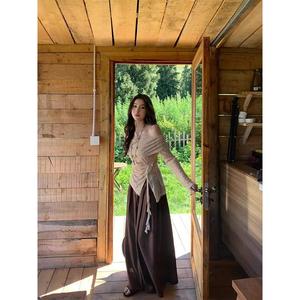温柔风甜美气质套装一字肩开叉格纹长袖蕾丝衫女早秋休闲裤两件套