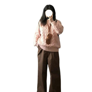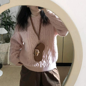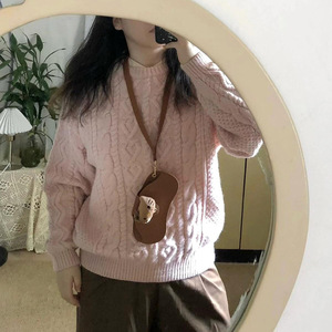韩系温柔风粉色麻花针织衫毛衣女秋冬2025新款小个子圆领套头上衣