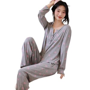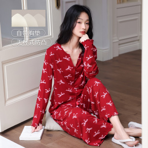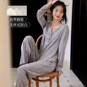 7030彩棉螺纹春秋季带胸垫女士睡衣可爱长袖长裤套装开衫网红蝴蝶