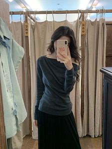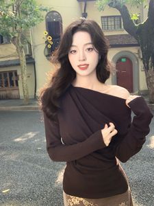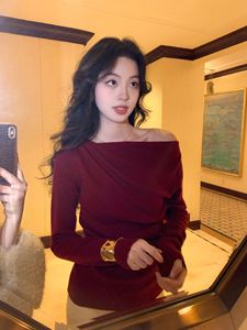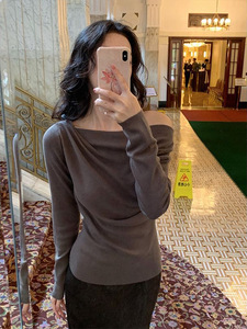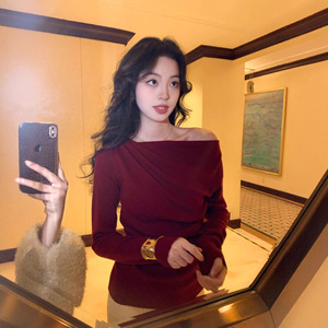 法式气质白色斜肩长袖针织打底衫女高级感毛衣内搭绝美上衣秋冬季